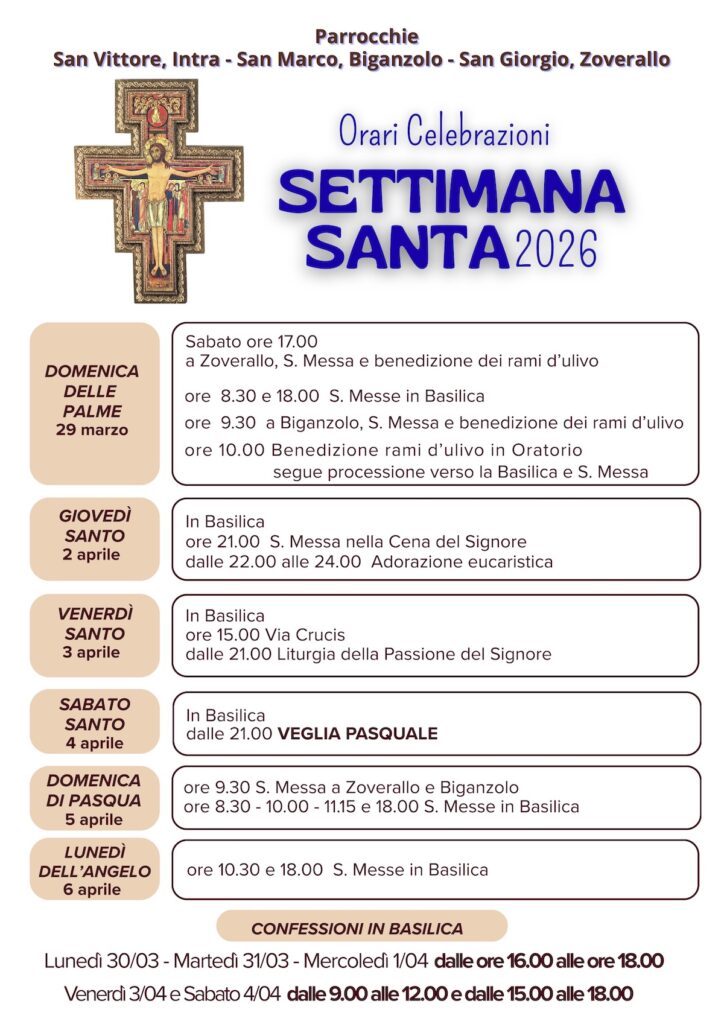 La celebrazione delle Palme si svolgerà sabato a Zoverallo alle 17, domenica 29 a Biganzolo alle 9.30 e a San Vittore alle 10 con la benedizione dei rami d’ulivo in Oratorio e la Messa in basilica. Sempre in San Vittore, durante il Triduo, l’appuntamento prevede giovedì alle 21 la Messa nella Cena del Signore e a seguire l’Adorazione eucaristica, venerdì 3 aprile alle 15 la Via Crucis e alle 21 la Liturgia della Passione del Signore. Sabato Santo, alle 21 la Veglia pasquale.