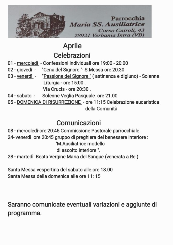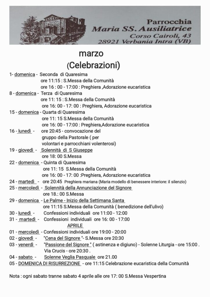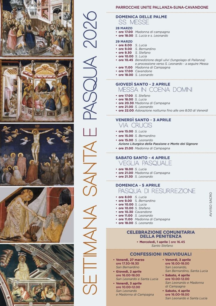 Domenica 28 marzo appuntamento per la Messa delle Palme alle 17 a Madonna di Campagna e alle 18 in Santa Lucia e San Leonardo. Domenica 29 marzo saranno tante celebrazioni sul territorio. Tra queste, la benedizione degli ulivi sul lungolago di Pallanza alle 10.45 e a seguire la Messa a Madonna di Campagna. La Messa di Coena Domini, come la Via Crucis il Venerdì santo, si svolgeranno in tutte le parrocchie. Sabato Santo, la Veglia pasquale alle 18 ikn Santa Lucia, alle 21 in Madonna di Campagna e alle 21.30 in San Leonardo.
