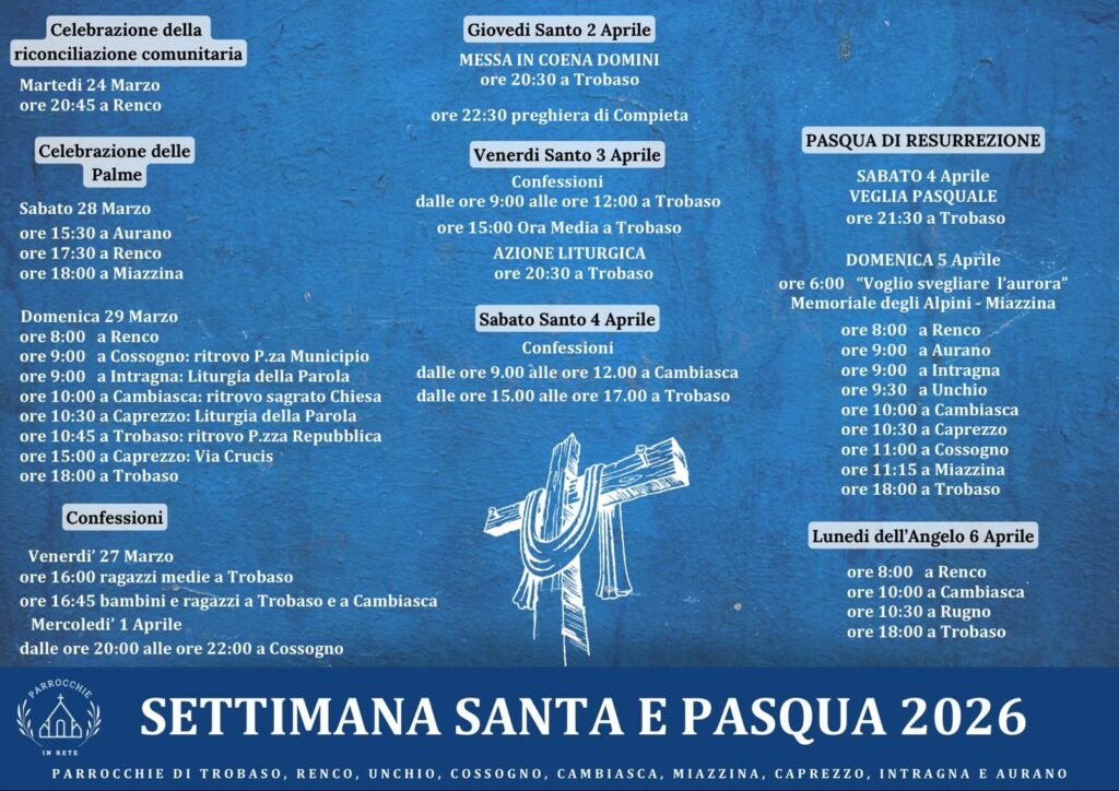 La celebrazione delle Palme sarà sabato 28 marzo ad Aurano alle 15.30, a Renco alle 17.30, a Miazzina alle 18 e domenica 29 marzo alle 8 a Renco, alle 9 a Cossogno e Intragna, alle 10 a Cambiasca, alle 10.30 a Caprezzo (Liturgia della Parola), alle 10.45 a Trobaso, alle 15 a Caprezzo (Via Crucis) e alle 18 a Trobaso.